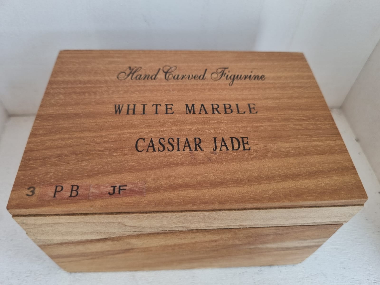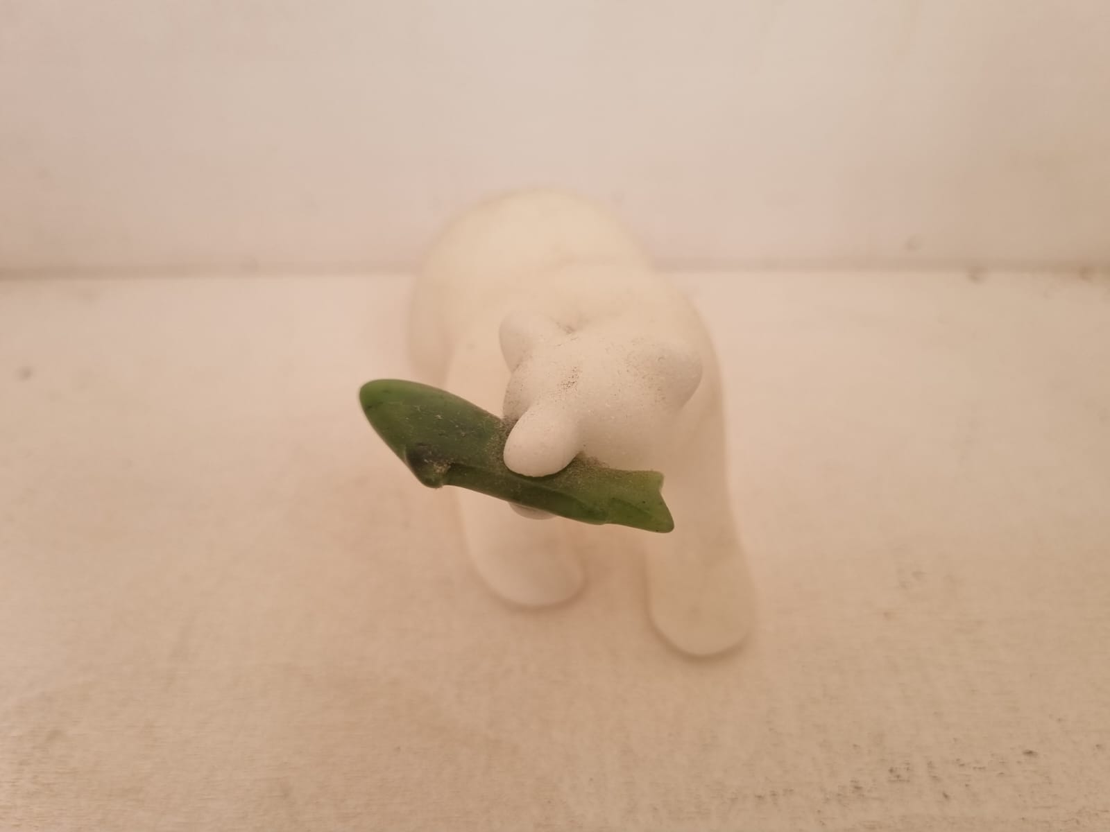 Orso bianco in marmo che pesca salmone in giada, soprammobile originale con garanzia